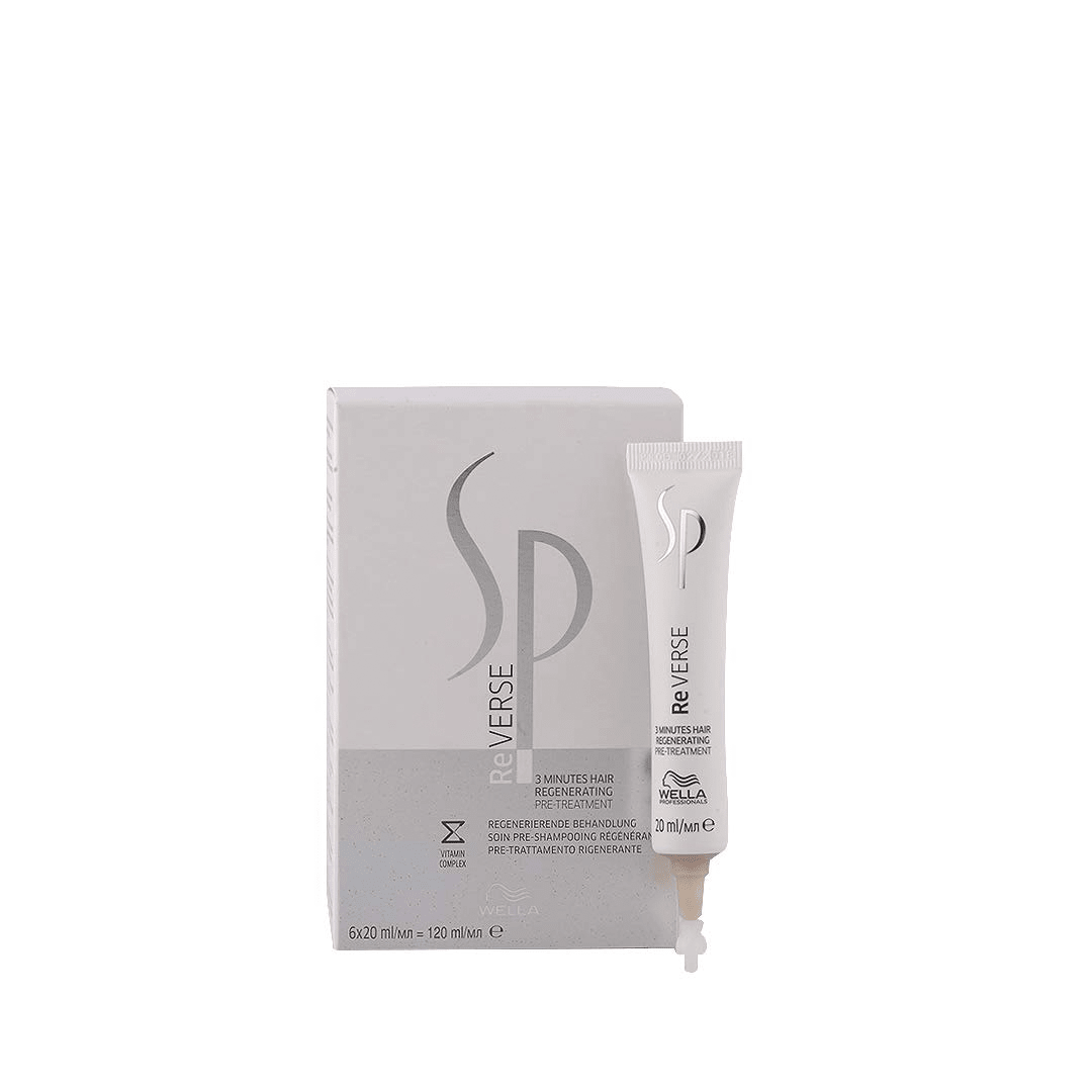 Tratamiento pre-champú en viales.Tratamiento regenerador en 3 minutos que le da la máxima vitalidad al cabello cansado y sin vida. Repara y protege intensamente la fibra capilar y devuelve una elasticidad extraordinaria.Modo de empleo:Aplique el contenido de un vial de Wella SP Reverse 3 Minutes Regenerating Hair Pretratamiento en cabello húmedo antes de lavar con champú. Dejar actuar durante 3 minutos y enjuagar bien.
